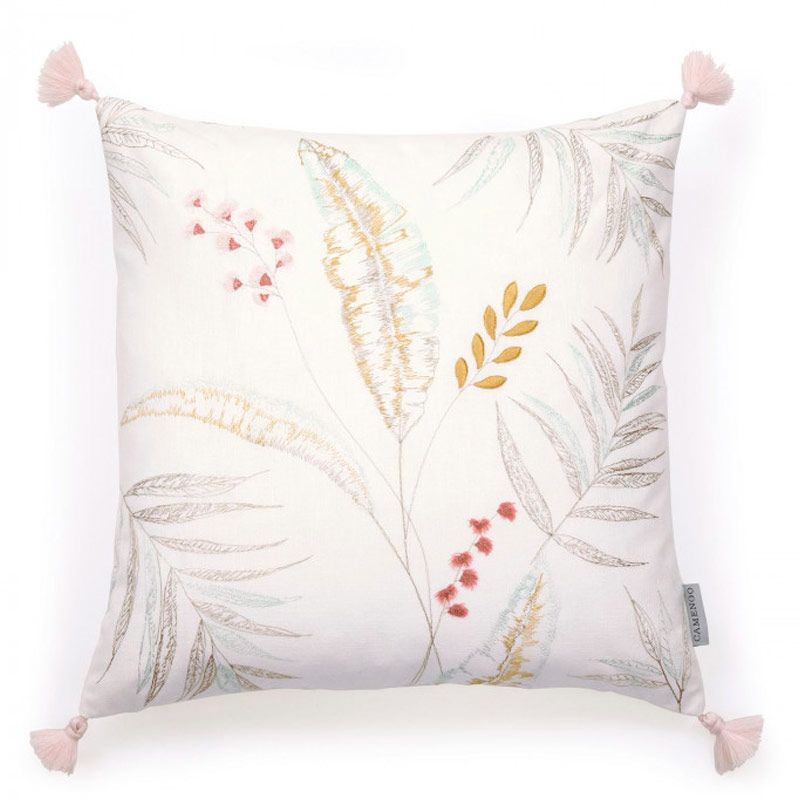 Funda de cojín con aspecto de algodón bordado, con pompones en los extremos. Cierre con cremallera invisible. Disponible en tres estampados diferentes.