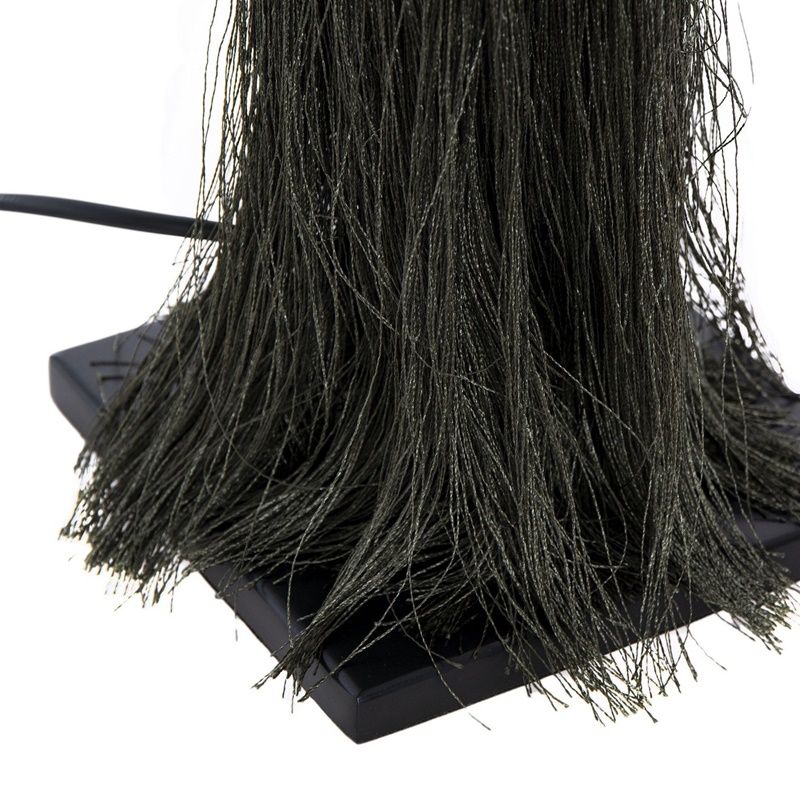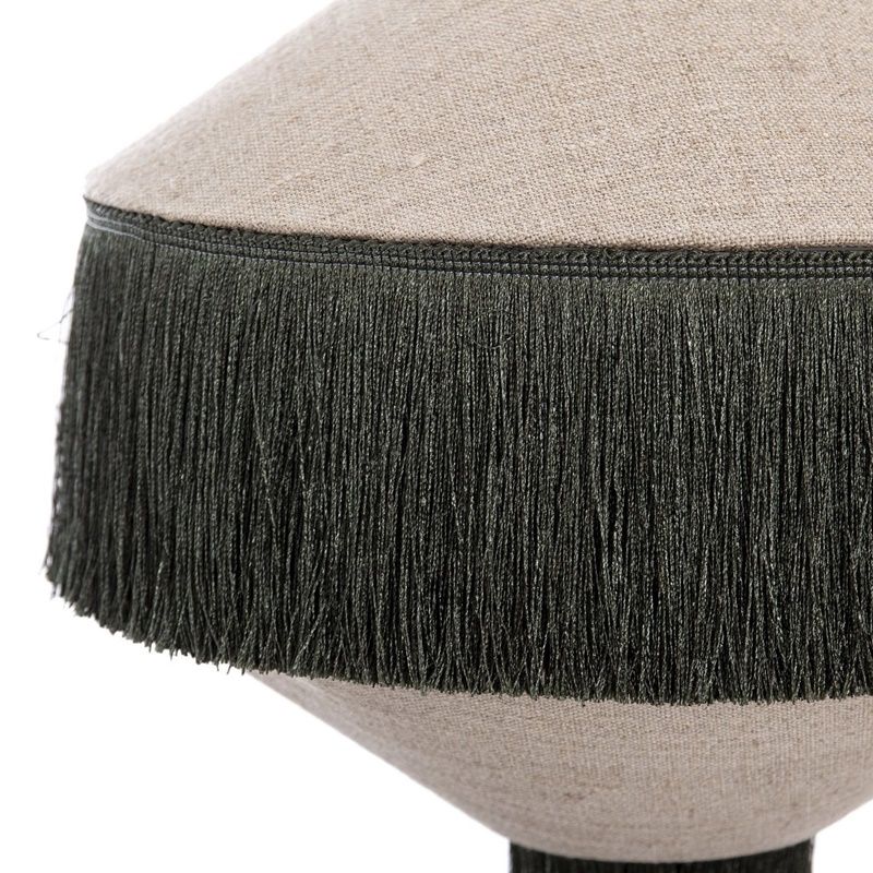 Lámpara de sobremesa con flecos en color verde, fabricada en hierro, lino y poliéster.