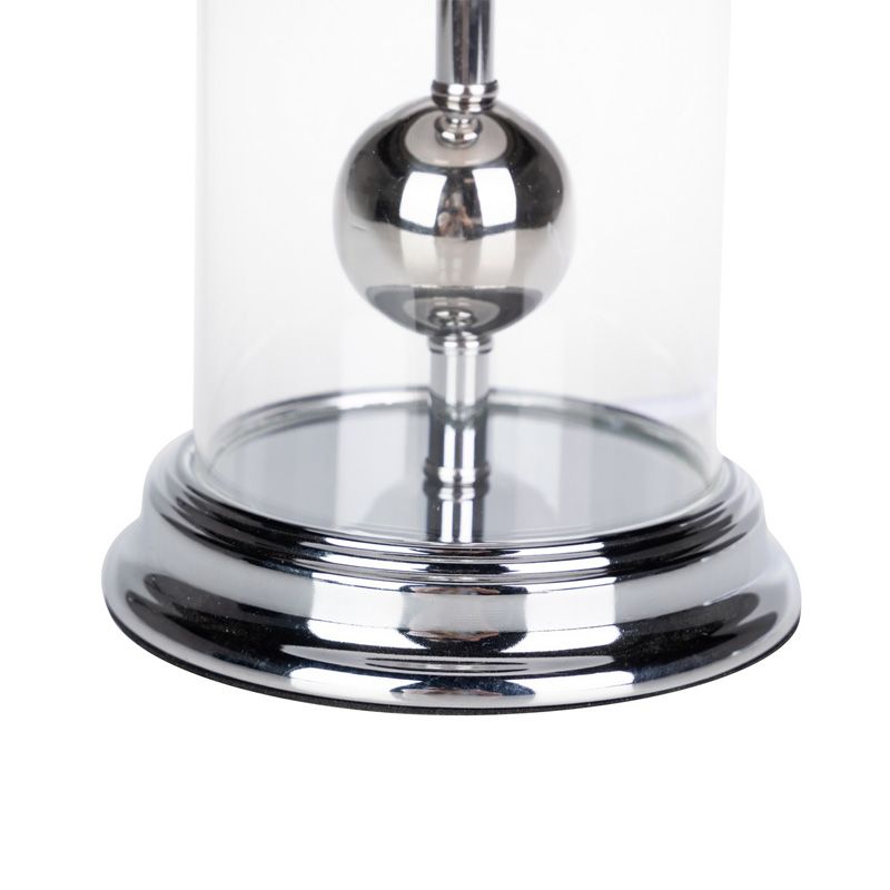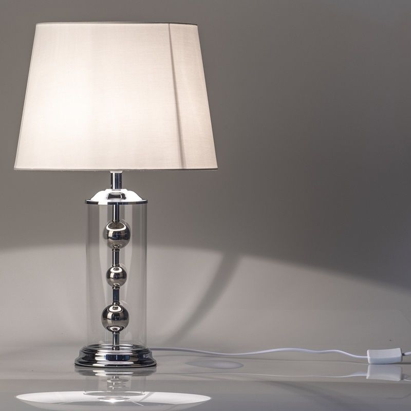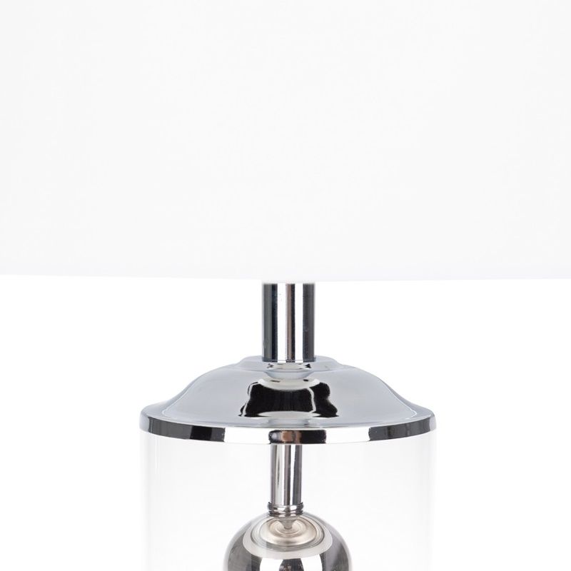 MATERIAL: Cristal, metal y textil. COLOR: Beige DIMENSIONES: 35 cm x 35 cm x 59 cm PESO: 1,25 kgs. Medida base: 13,4X14,5X40 cm; Medida pantalla: 28X36X25 cm; Pantalla: 35X28X25 cm; Pie: 14X14X40 cm; Cable con interruptor: 140 cm