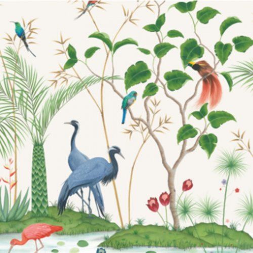 Un jardín paradisíaco, donde un ibis rojo camina en una piscina poco profunda vigilado por grullas y aves exóticas entre los árboles y el follaje. El diseño está impreso digitalmente sobre un lino fino de ancho ancho.