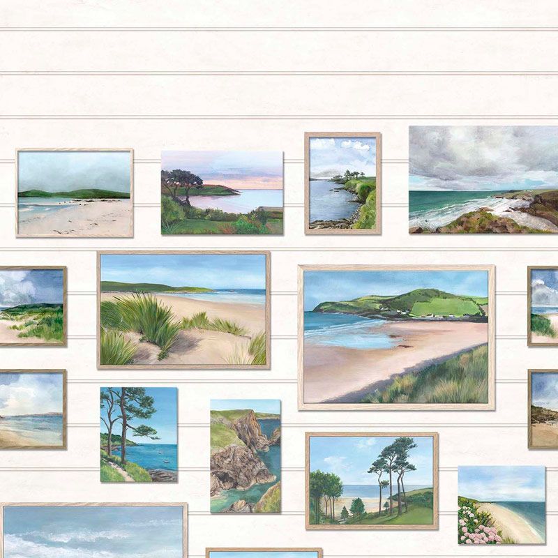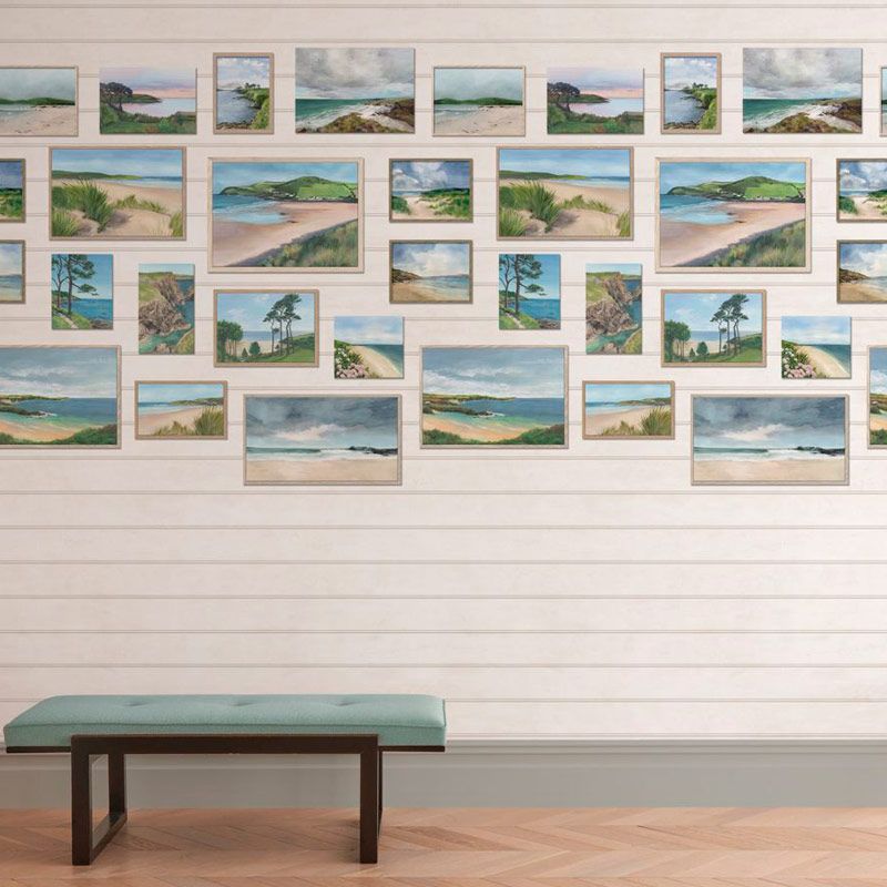 Pinturas de paisajes marinos en acuarela se exhiben en una pared con paneles de madera pintada.